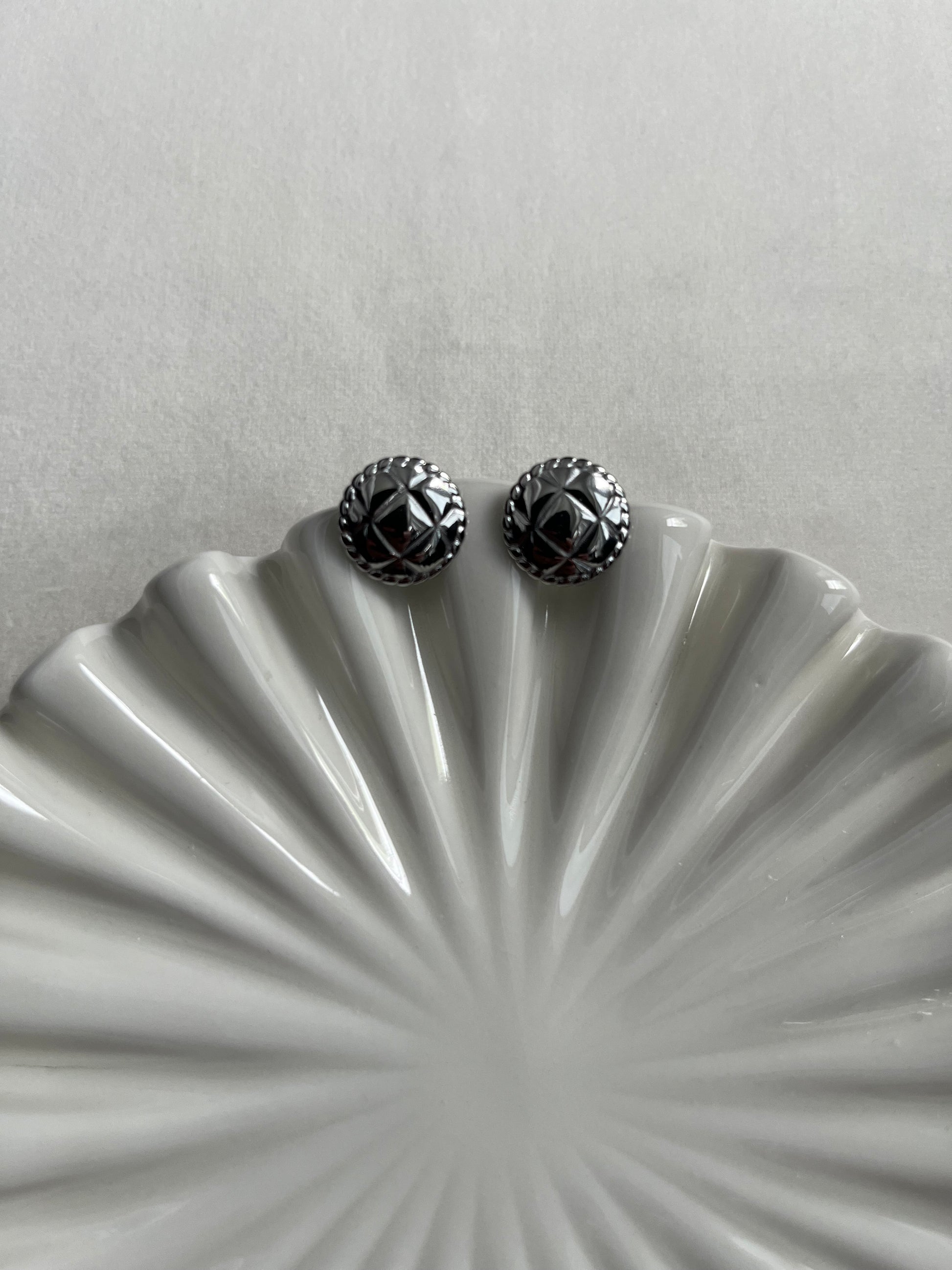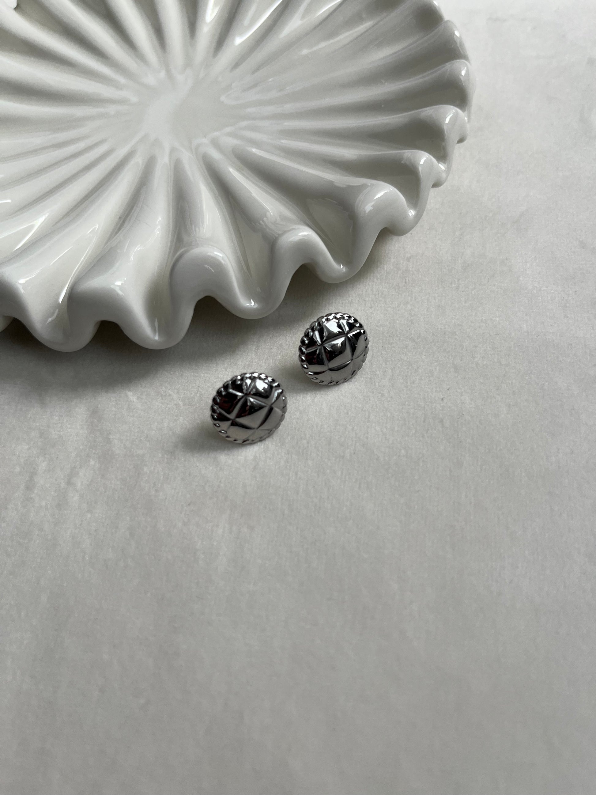 18K white gold plated stainless steel vintage style coin stud earrings. For pierced ears.