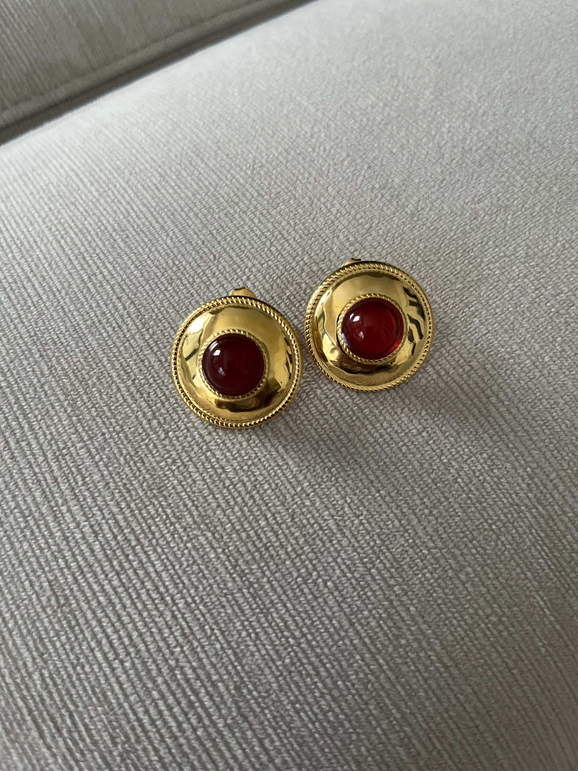 18K gold plated stainless steel and burgundy red stone set round earrings. Oversized and vintage style.