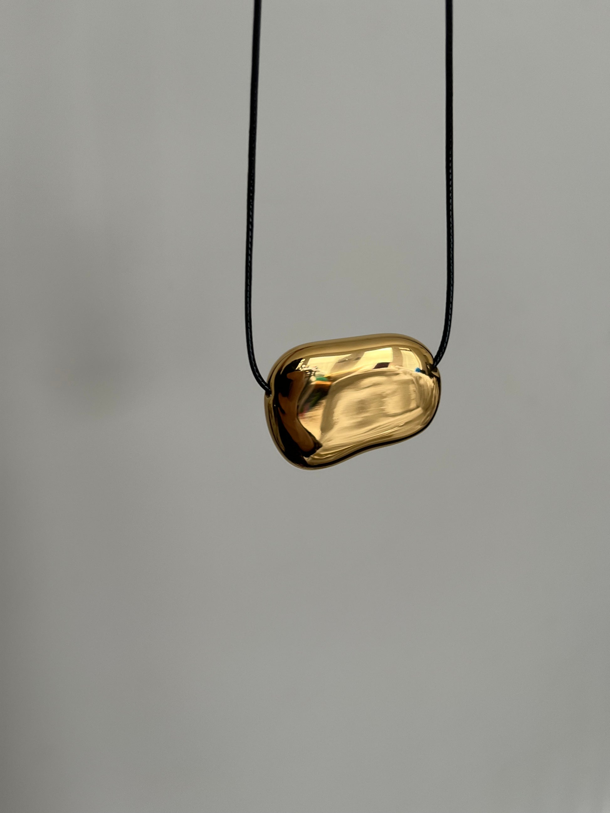 18K gold plated stainless steel chunky yet fluid style gold pendant on a black adjustable cord. Can be worn as a short choker style or as a long pendant.