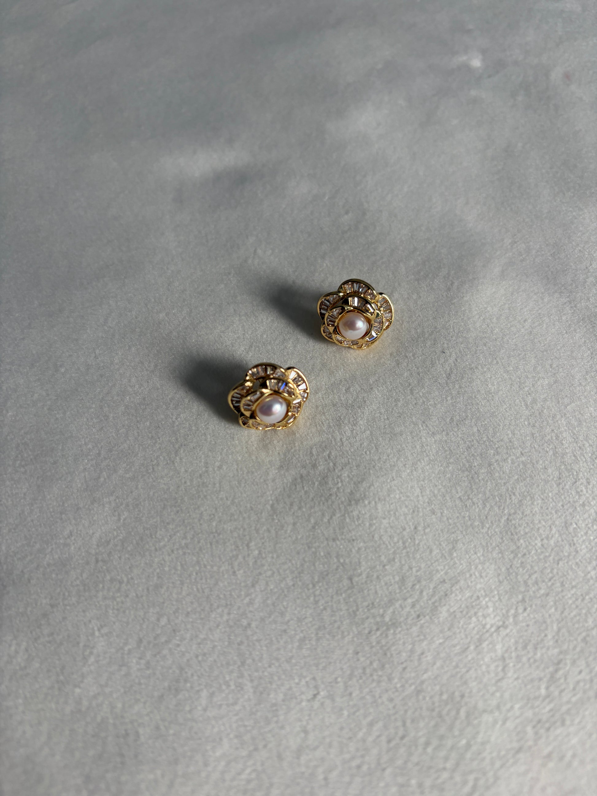 18K gold plated sterling silver, zirconia and pearl stud earrings. Vintage style.