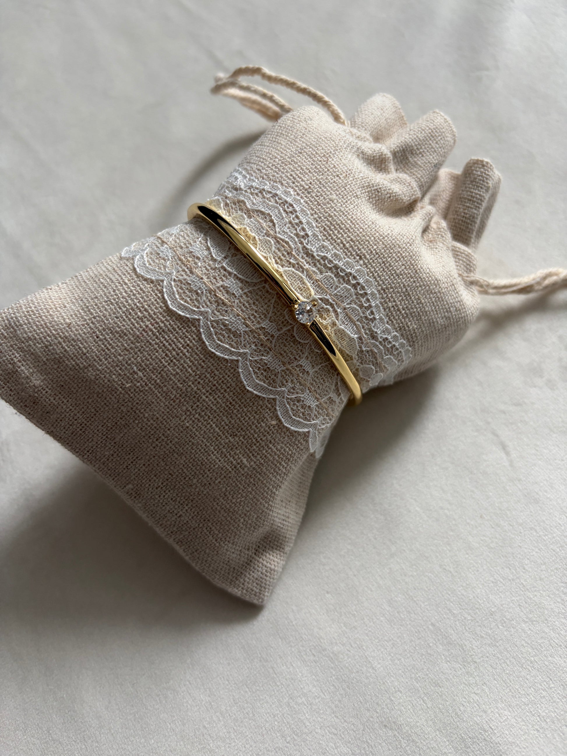 18K gold plated stainless steel open cuff style bracelet set with a single zirconia.