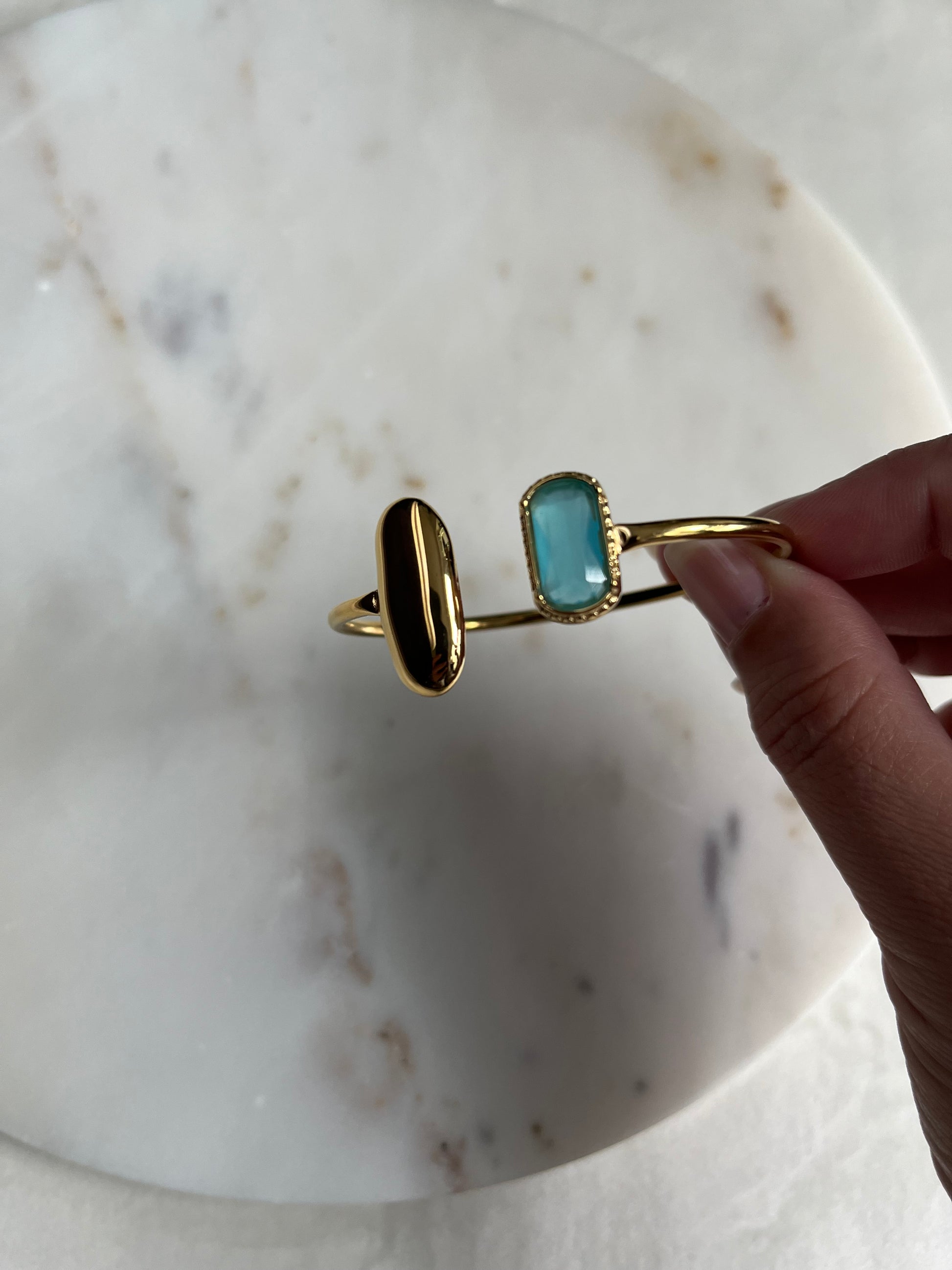18K gold plated stainless steel dainty open cuff bangle set with a turquoise coloured simulated zircon stone.