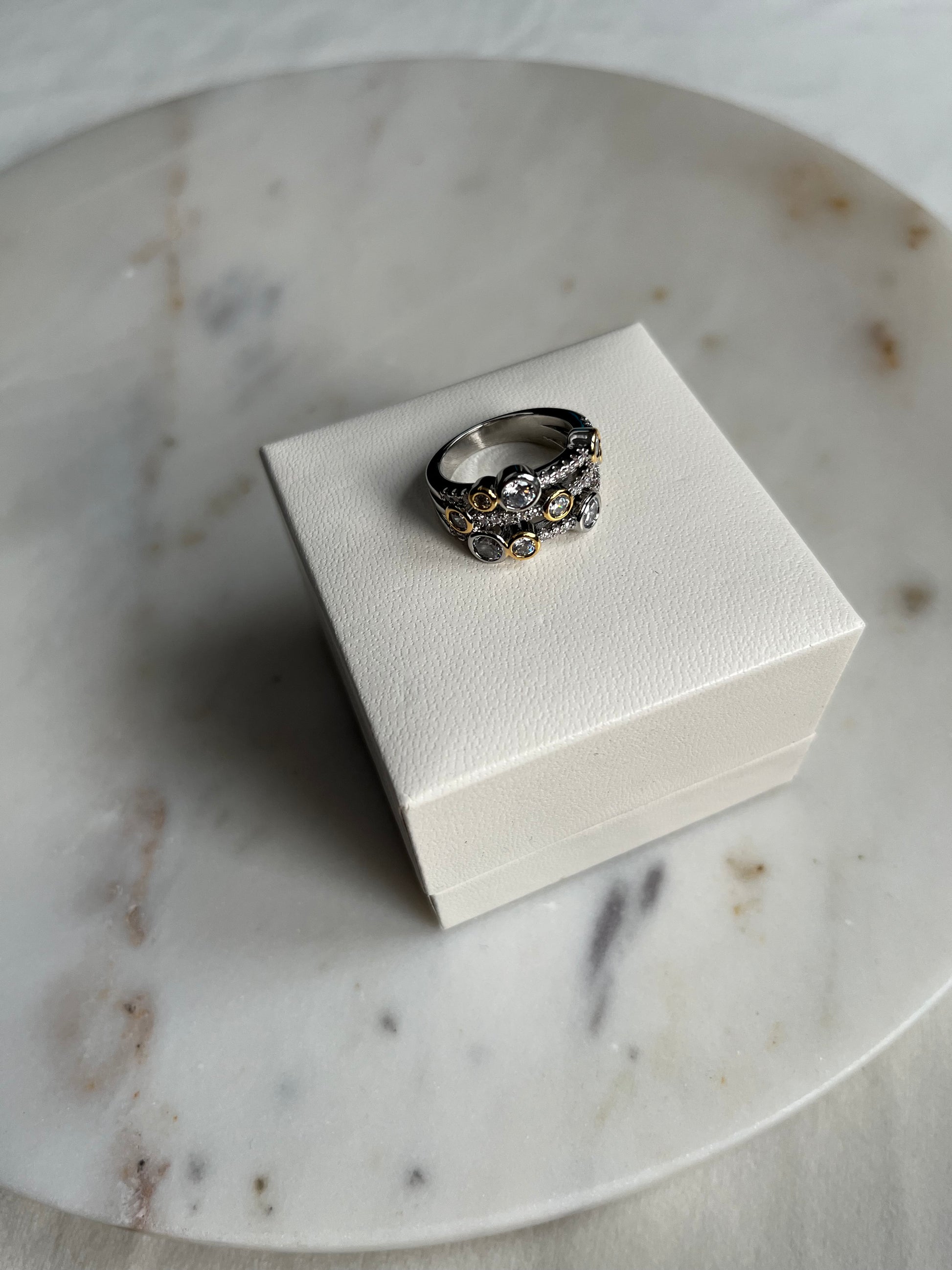 18K two tone gold plated stainless steel and zirconia set dress ring.